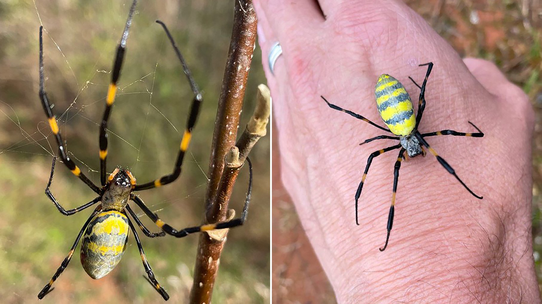 By that point, they are much harder to miss. Female Joro spiders have a vivid appearance, with a bright yellow body marked by blue stripes and flashes of red.