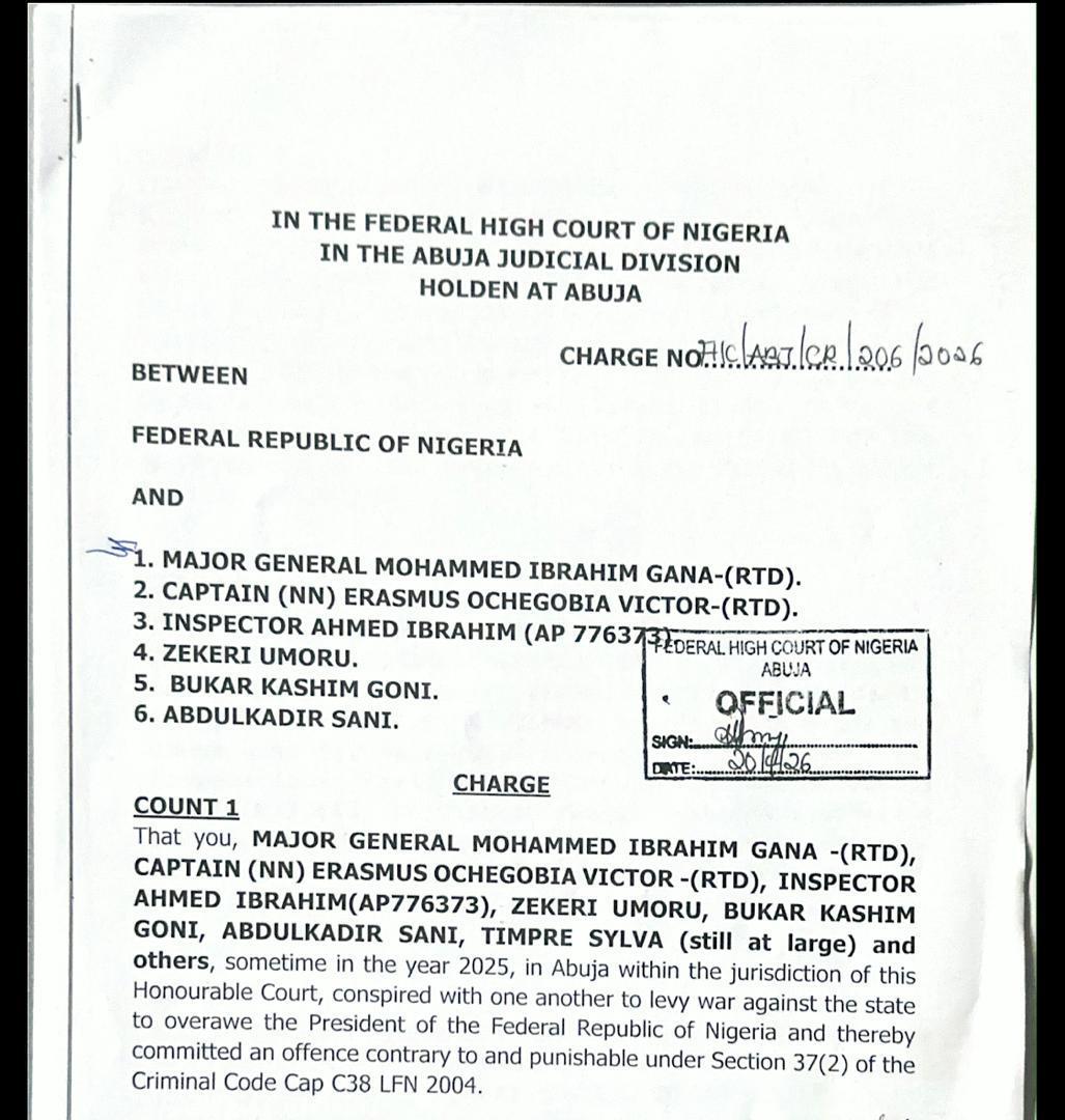 The charge, filed on Monday by the Office of the Attorney-General of the Federation and signed by the Director of Public Prosecutions, Rotimi Oyedepo (SAN), accuses the defendants of offences ranging from alleged treason and terrorism to failure to disclose security intelligence and money laundering linked to terrorism financing.